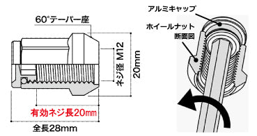 | Remarks | * When driving on public roads, make sure that the wheel nuts are located inside the fender. * Before installation, please check that there are no abnormalities on the hub bolt on the vehicle side or the seating surface on the wheel side (such as crushed threads, iron powder or foreign matter attached). * Tighten to the specified torque, and after driving 100 km, be sure to retighten to the specified torque. * Do not use an impact wrench. Over-torque can lead to damage, and impacts can cause abnormal wear and metal fatigue. * When using a cross wrench, never apply pressure with your foot. * When installing the wheel, do not install if the wheel nut threads do not reach the wheel by 10 mm or more. * For vehicles equipped with long hub bolts, be careful not to let the screws bottom out into the caps. * Please note that the logo on the aluminum cap and the logo on the nut body will not be aligned. * Specifications and production of this product may be changed or discontinued without notice. |