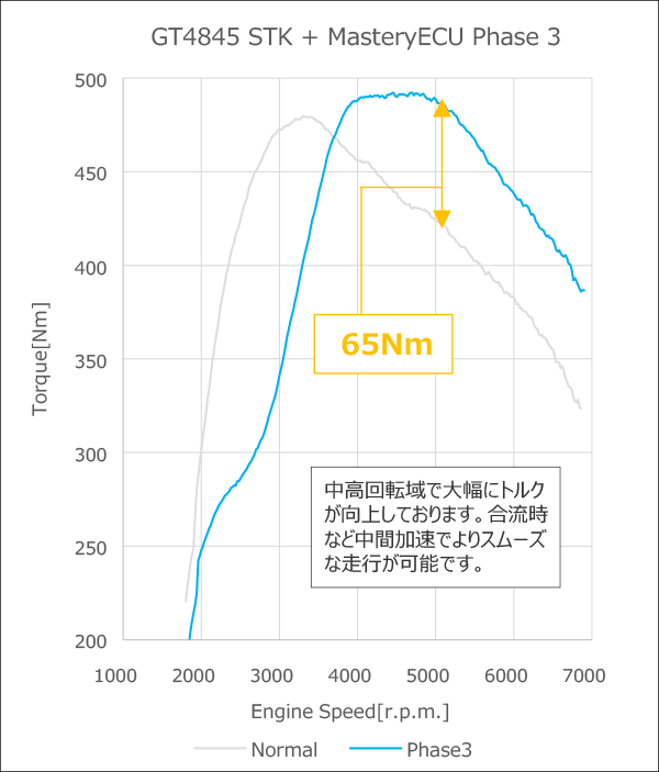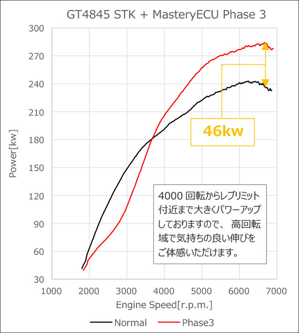 | Remarks | With a standard turbine, including the boost-up specification, the boost drops at high RPMs, but with the GT4845, the boost pressure is maintained even at high RPMs.When testing the FL5 at Fuji Speedway, compared to the Mastery ECU PHASE 2 boost-up model, the top speed went from 232km/h to 244km/h, an improvement of about 3 seconds in lap time, or +12km/h! |