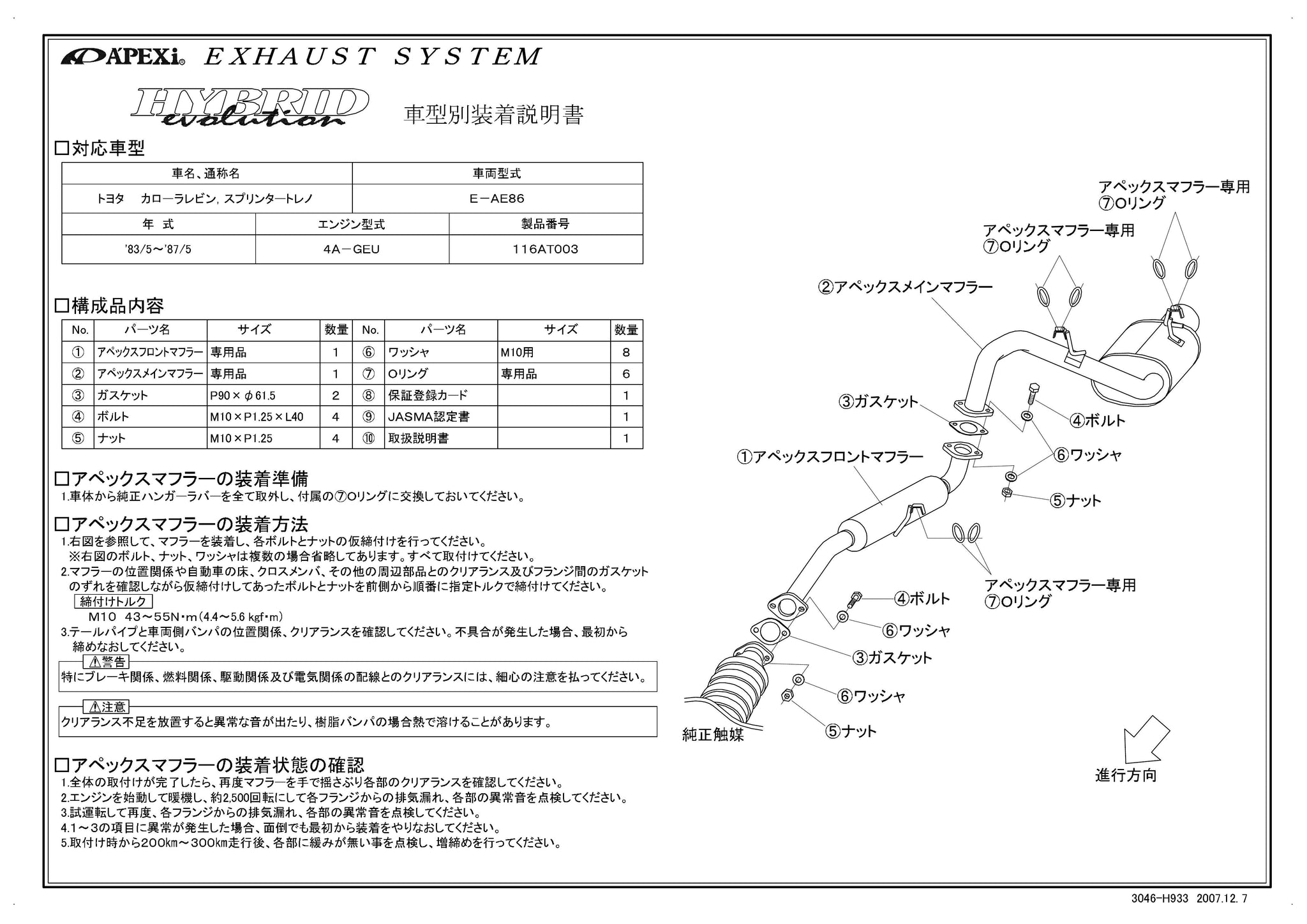 | Product Description | Model Year: 83/05-87/05 Main Pipe Diameter: Ï_54 ___ Ï_60 No of Pieces: 2 Tail Diameter: Ï_105 Oval Exhaust System Type: Exchange immediately after the SUPER CATALYZERlyst Sound Level: 94 Ground Cleance :125 |