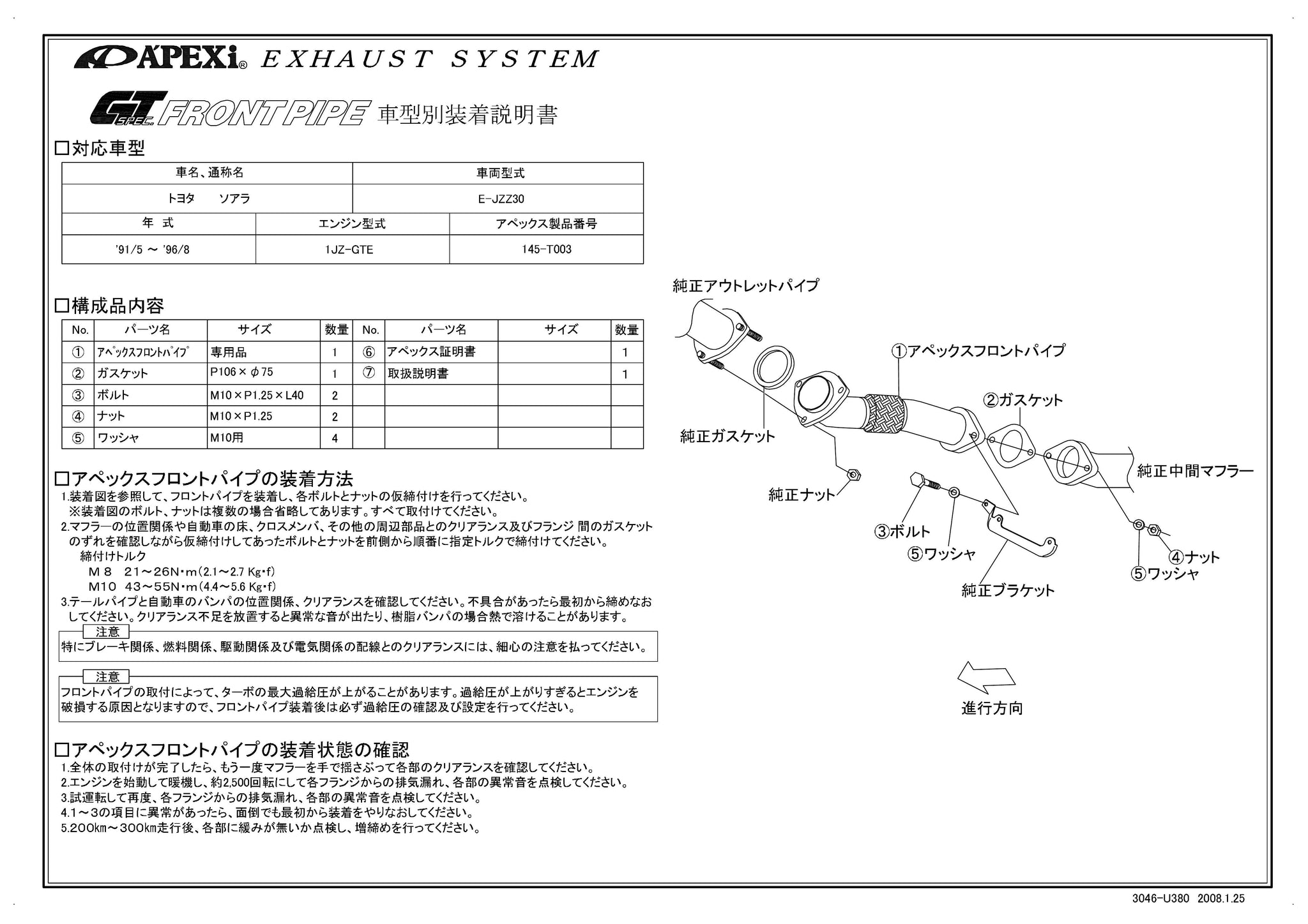 | Product Description | Model Year: 91/05-96/08 Main Pipe Diameter: Ï_75 ___ Ï_80 No of Pieces: 1 Tail Diameter: - Exhaust System Type: - Sound Level: - Ground Cleance :- |
