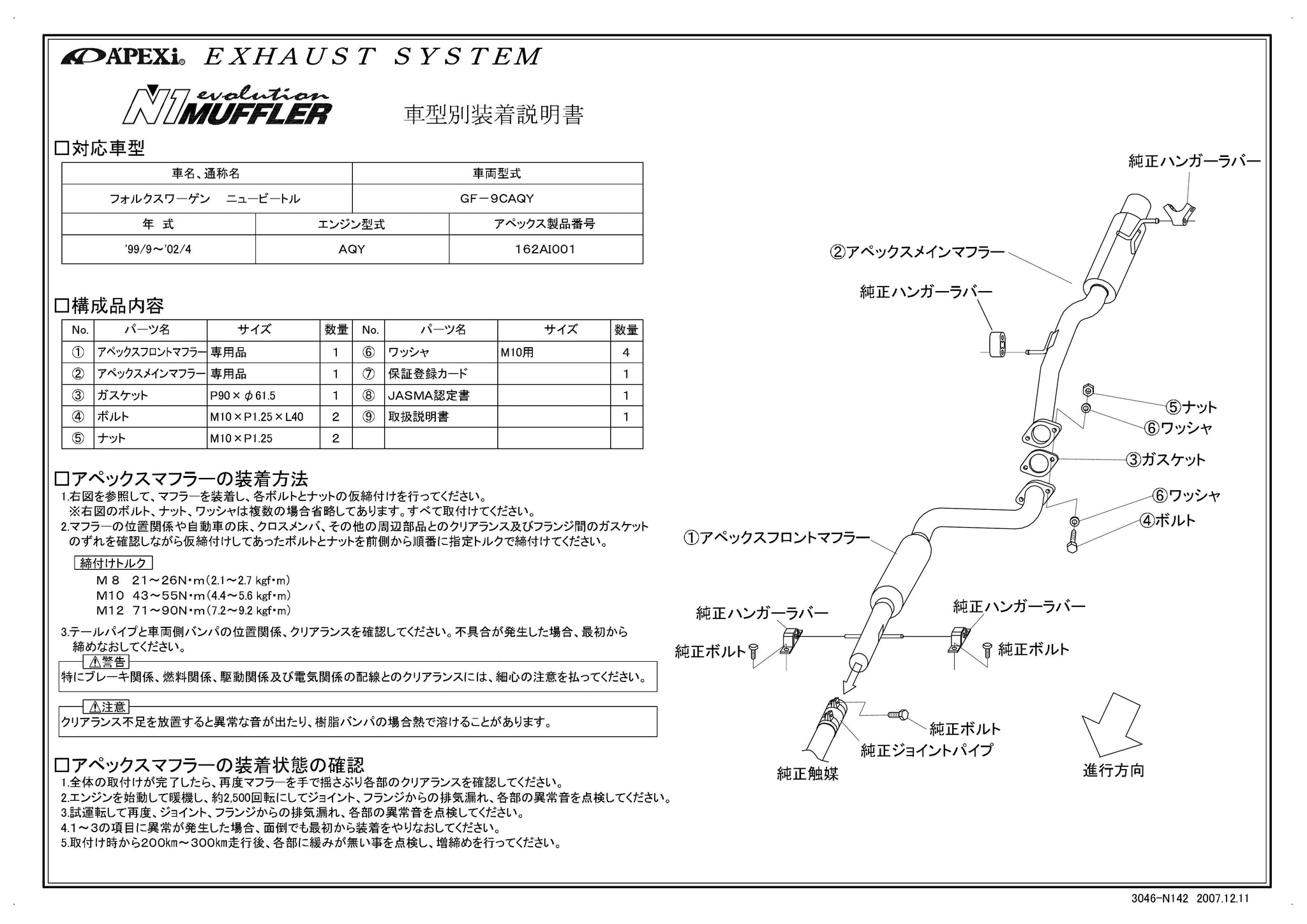 | Product Description | Model Year: 99/09-02/04 Main Pipe Diameter: Ï_54 ___ Ï_60 No of Pieces: 2 Tail Diameter: Ï_120 / Ï_90 Exhaust System Type: Exchange immediately after the SUPER CATALYZERlyst Sound Level: 92 Ground Cleance :120 |