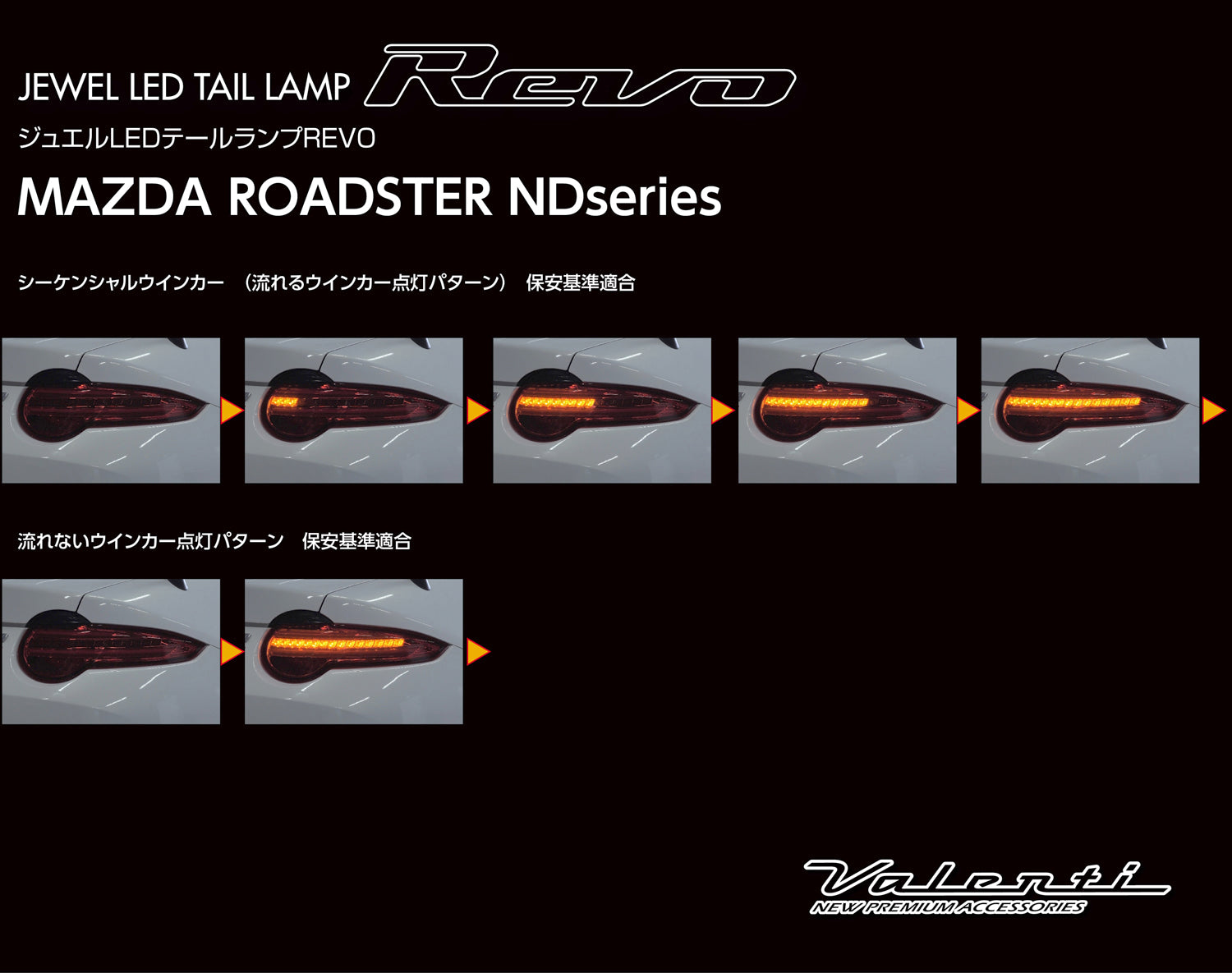 | Product Description | A new lineup will be added to the "REVO" series. The compatible model is the popular Mazda Roadster / Roadster RF (ND series), and it is a long-awaited new model tail lamp that uses a flowing turn signal! ■Sequential blinker (flowing blinker) adoption! *Compliant with safety standards Adopted "sequential blinker" that complies with safety standards in Japan due to revision of law! It also complies with safety standards, and can be easily changed to "flow" or "do not flow" simply by changing some wiring connections. ■We adopt high brightness 120LED & 4LED light bar! The slim and long design light bar gives a sporty rear view. An all-LED model that uses high-brightness LEDs for all of the small 36 LEDs/brake 54 LEDs and blinker 30 LEDs per side. In addition, the brake lamps are designed so that the LED chips are not directly visible, giving a more stylish impression even when the lights are off. ■Two color variations that you can choose according to your preference and vehicle! Two tail lamp body colors: Red lens/black Light smoke/black The garnish part can be painted to the body color etc. according to your preference. Explanation image of the garnish part (At the time of shipment, the color of the unpainted material is black.) |