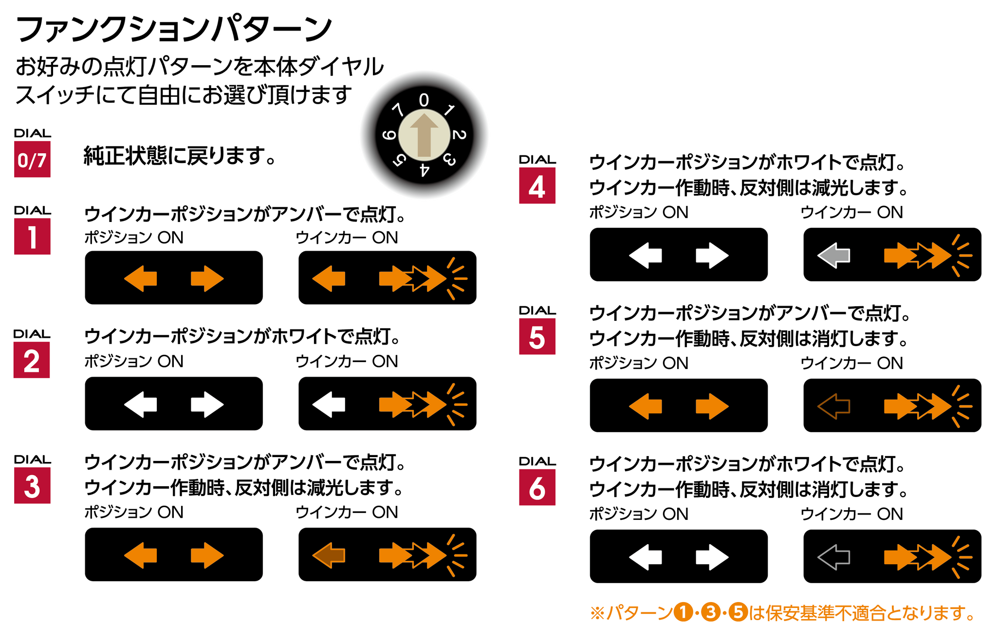 | Remarks | *When the light is turned on in patterns 1, 3, or 5, it does not comply with safety standards. ■Complies with safety standards *Depending on the lighting pattern, it may not comply with safety standards. ■1 year warranty ■Standard operating time 1.0 to 2.0 hours *Position wiring can be easily done by using the separately sold "Daytime Lamp Easy Wiring Kit Type C" (part number: DTL-KC). Toyota Prius (50 series) late model ZVW51/ZVW55, June 2018~ (Front turn signal only) Toyota Corolla Sports (including hybrid) NRE21#/ZWE21#, From December 2018 (Front turn signal only) Toyota Corolla Touring (including hybrid) NRE21#/ZRE21#/ZWE21#, From September 2019 (Front turn signal only) Toyota Corolla (including hybrid) NRE21#/ZRE21#/ZWE21#, From September 2019 (Front turn signal only) Toyota GR86 ZN8, From October 2021 (Front turn signal only) Subaru BRZ ZD8, From July 2021 (Front turn signal only) |