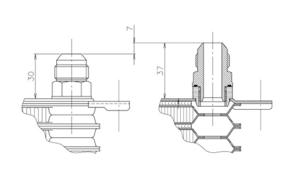 | Product Description | The IN/OUT extraction part of the core body is now replaceable with an adapter (thread size M18 x P1.5). *Excluding 12 steps. This allows you to exchange* to an adapter that corresponds to each fitting size. *When installing the AN10 adapter union, the height when installing the fitting will be approximately 7 mm higher than the old specification oil cooler core. (Figure 1) |