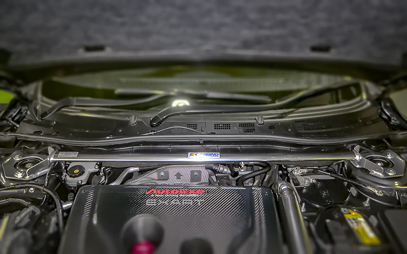 | Product Description | Suppresses twisting of the body and improves handling and stability. Standard item for body reinforcement. By connecting the left and right suspension upper mounting parts (strut house) and suppressing the so-called "falling phenomenon" of the strut house, the behavior of the suspension is stabilized. It suppresses the twisting of the body that occurs when cornering and improves handling and stability. The pipe uses an oval shaft with high torsional rigidity. (Pipe diameter 20 mm x 40 mm) The material is aluminum. Installation is bolt-on. |