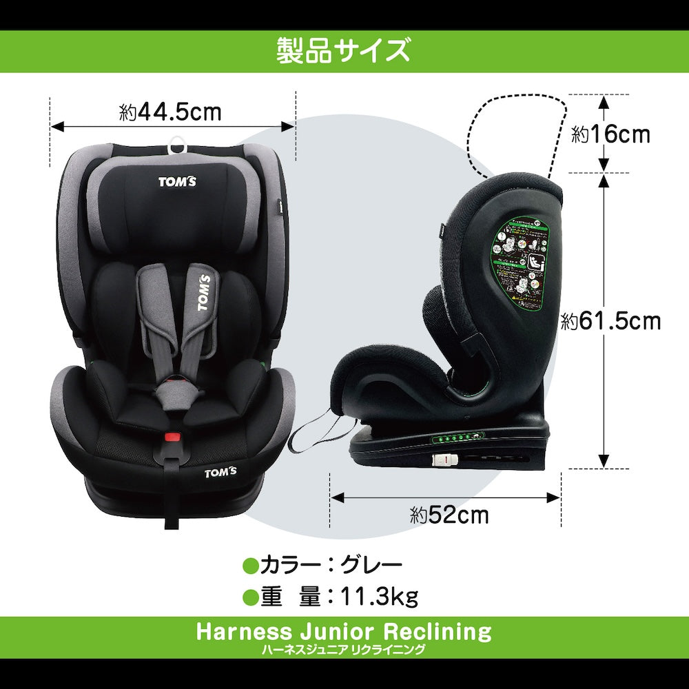 | Product Description | [TOM'S Harness Junior Recliner]Conforms to the latest safety standard R129 (i-Size) and improves safety from impact. It also comes with an easily adjustable head support and a reclining function that allows you to adjust the angle.It is suitable for a wide range of heights, from 76cm to 150cm (reference: age 15 months to 11 years, weight 9kg to 36kg), and can be used for a long period of time as your child grows. |